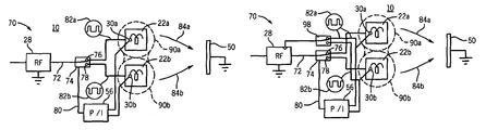 The output of the maximum-determining circuits 34 a and 34 b each connected respectively to the temperature sensors 30 of electrodes 22 a and 22 b may also be used to control the setting of the variable resistance 52. When the switch 53 connects the resistance 52 to the output of the power oscillator 28, the maximum-determining circuits 34 a and 34 b serve to reduce the resistance of resistance 52 as electrode 22 b gets relatively hotter. Conversely, when the switch 53 connects the resistance 52 to ground, the maximum-determining circuits 34 a and 34 b serve to reduce the resistance of resistance 52 as electrode 22 a gets relatively hotter. The action of the switch 53 and variable resistance 52 is thus generally to try to equalize the temperature of the electrodes 22 a and 22 b.