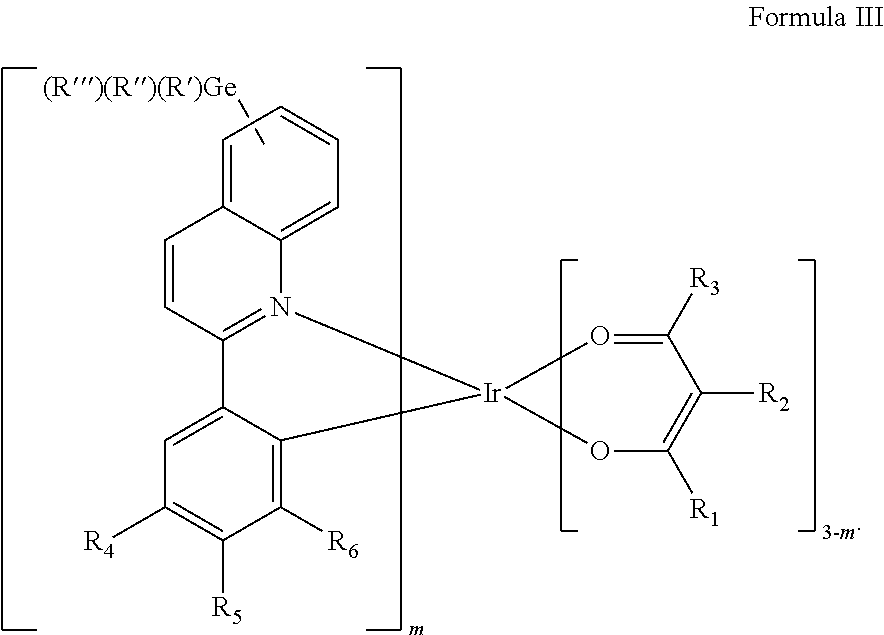 | US20080074033A1 (en) * | 2006-06-14 | 2008-03-27 | Alex Sergey Ionkin | Electroluminescent iridium compounds with silylated, germanylated, and stannylated ligands, and devices made with such compounds |