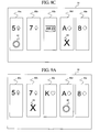 FIGS. 9A, 9B and 9C are front elevation views of a display device displaying a set of cards having a wild activation symbol and a wild termination symbol.