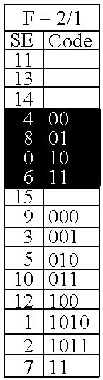 Table 4(f) does not have any sub VLC table. This implies that the fixed length decoding algorithm with F=6 establishes lookup tables in one round. Fixed length decoding algorithms with F=1˜5 need the next round.