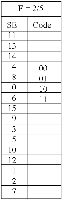 A blank region in the “Code” column refers that these codes are released after the first round of lookup table establishment. In other words, lookup table for these codes is established after the first round, so they do not belong to any sub VLC table and are not denoted with any colors (shading) but have normal fonts. Respective sub VLC tables are denoted and separated by different fill colors (shading) and different fonts. Let Table 4(b) be taken for example. From top to down, the first sub VLC table (including SE=11 and SE=13) is denoted in bold letters with fill color; the second sub VLC table (including SE=14, SE=4, SE=8, SE=0 and SE=6) is denoted in italic letters without fill color; the third sub VLC table (including SE=9, SE=3, SE=5, SE=10, SE=12, SE=1, SE=2 and SE=7) is denoted in bold letters with fill color. All codes in a VLC table or in a sub VLC table must be different each other. The number of the sub VLC tables generated after the first round depends on the algorithm selected and the original VLC table. If the number of sub VLC table equals 0 as indicated in Table 4(f), this implies that the lookup table establishment is completed; otherwise, based on sub VLC tables, a lookup table for the next round is established.