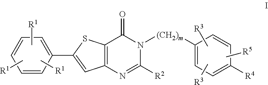 As summarized in Scheme 1, compounds of formula I may be prepared by either condensing compounds of formula 2 with compounds of formula 3 to generate the thiophenopyrimidone central bicyclic moiety in situ or via alkylation/arylation of compounds of formula 18 with alkylating agents of formula 19 or arylating agents such as borates of formula 24. Depending on the particular molecule of formula I being prepared, R4 can either be fully completed or elaborated after assemblage of the core structure of formula I.