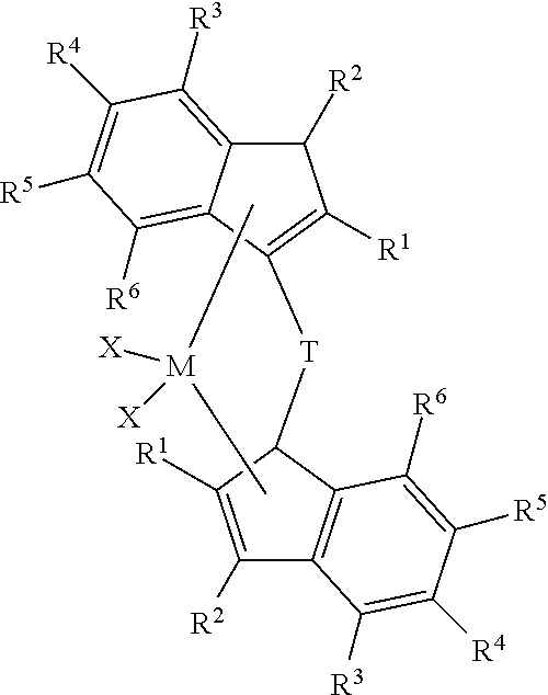 - each X is, independently, selected from the group consisting of hydrocarbyl radicals having from 1 to 20 carbon atoms, hydrides, amides, alkoxides, sulfides, phosphides, halides, dienes, amines, phosphines, ethers, and a combination thereof, (two X's may form a part of a fused ring or a ring system); each R 1 , R 2 , R 3 , R 4 , R 5 , and R 6 , is, independently, hydrogen or a substituted or unsubstituted hydrocarbyl group, a heteroatom or heteroatom containing group; further provided that any two adjacent R groups may form a fused ring or multicenter fused ring system where the rings may be aromatic, partially saturated or saturated; and further provided that any of adjacent R 4 , R 5 , and R 6 groups may form a fused ring or multicenter