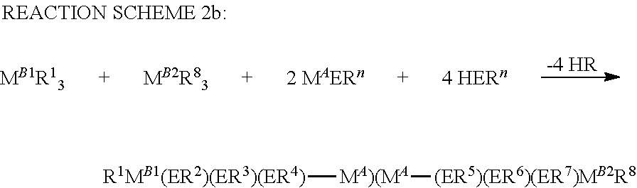 In certain embodiments, MA is a divalent metal atom, and the formula is Z-MA-(ER1)(ER2)(ER3)MBR4, wherein Z is selected from alkyl, aryl, heteroaryl, alkenyl, amido, silyl, and inorganic and organic ligands.