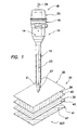 - This narrow width might be provided with a point configuration or in the case of a preferred embodiment, a line or rectangular configuration having the narrow width and a longer length. With the length oriented parallel to the fibers of a particular laser a reduced penetration force 34 is required to push the obturator 18 through the particular layer.