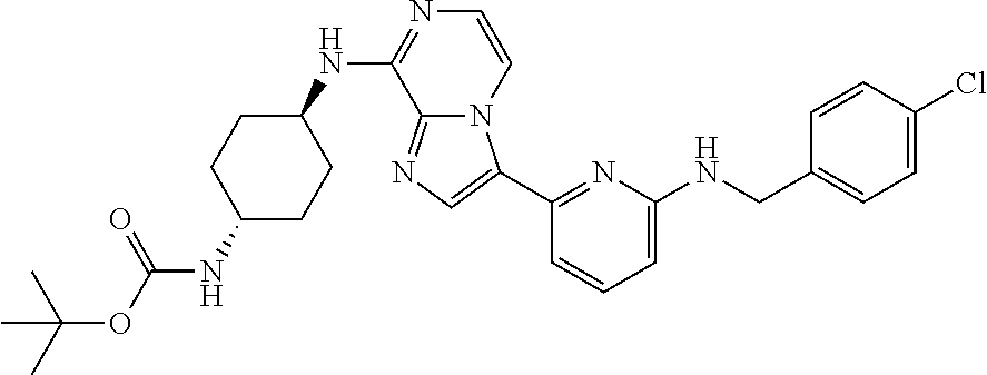 - ZRWNRLZMEUQNCM-AFARHQOCSA-N CC(C)(C)OC(=O)N[C@H]1CC[C@H](CC2=NC=CN3C(C4=NC(CCC5=CC=CC(Cl)=C5)=NC=C4)=CN=C23)CC1 Chemical compound CC(C)(C)OC(=O)N[C@H]1CC[C@H](CC2=NC=CN3C(C4=NC(CCC5=CC=CC(Cl)=C5)=NC=C4)=CN=C23)CC1 ZRWNRLZMEUQNCM-AFARHQOCSA-N 0.000 description 1