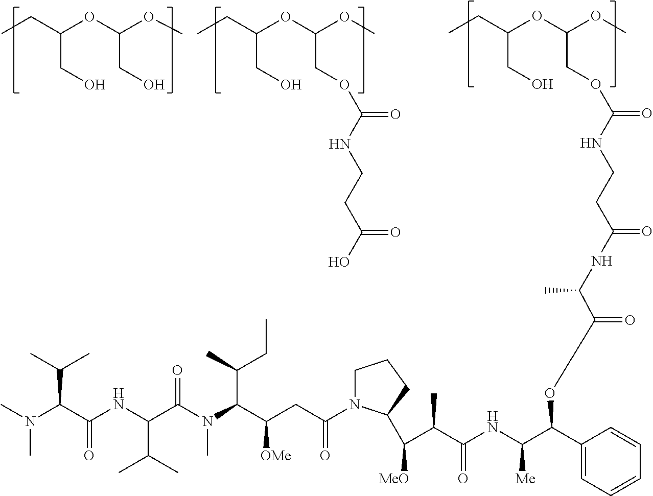 FIG. 3 provides the results for the tumor response in mice inoculated subcutaneously with BT474 tumors (n=12 for each group) after IV administration of vehicle; PBRM (trastuzumab) at 15 mg/kg; PBRM-drug polymer conjugates PHF-GA-(Auristatin F-hydroxypropylamide-L-Alanine)-(Trastuzumab-MCC) (Example 52, Auristatin F:Trastuzumab about 20:1 to 22:1) at 7.5 mg/kg; drug polymer conjugate PHF-GA-SH-(Auristatin F-propylamide-L-Alanine) (Example 51) (dosed at an auristatin dose that was equivalent to that present in Example 52 at 15 mg/kg) in combination with trastuzumab at 15 mg/kg dosed once every week for 3 weeks on day 1, day 8 and day 15 respectively. The results show reduction of tumor volume for Example 52 with 100% complete responses (11/11) and 100% tumor free survival (11/11). The vehicle, trastuzumab alone, combination of Example 51 and trastuzumab all showed an increase of tumor volume. The conjugation of PBRM to drug-polymer conjugate was necessary for the reduction of tumor volume as neither a drug-polymer conjugate in combination with a PBRM (Example 51 in combination with trastuzumab) nor PBRM (trastuzumab) alone showed reduction in tumor volume.