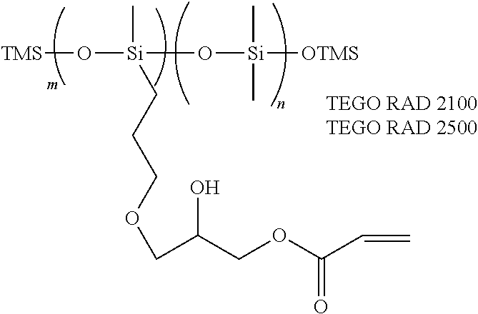Based on NMR analysis “TEGO Rad 2100” and “TEGO Rad 2500” are believed to have the following chemical structure: