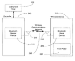 - the communications protocol may be implemented in both the wireless foot pedal 104 switch subsystem and instrument host 102 subsystem and arranged to enable either module to act as the master and the other as the slave subsystem as appropriate. More than one software subsystem may employ the protocol and aspects described herein, possibly using different security measures that prohibit synchronizing between remote or unintended slave devices.