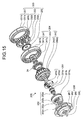 As shown in FIGS. 49 and 50, the clutch device 40 is disposed at the outer periphery of the first carrier 23 of the first planetary gear mechanism 20, and regulates the rotation of the first carrier 23. The clutch device 40 is a sprag type one-way clutch, and includes the first inner race (the second member) 41, the first outer race (the first member) 42, a clutch mechanism 49, a first bearing 44B, a second bearing 45B, a clutch support portion 46, an elastic body 47, and a retaining ring 48.