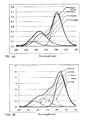 The next line (b) of the graph in FIG. 5 shows the absorption and emission spectra for a green emitting doped semiconductor nanophosphor. The absorption spectrum for this second phosphor includes the 380-420 nm near UV range, but that absorption spectrum drops substantially to 0 a little below 450 nm. This phosphor also exhibits a large Stokes shift from the short wavelength(s) of absorbed light to the longer wavelengths of re-emitted light. The emission spectrum of this second phosphor has a broad peak in the wavelength region humans perceive as green. Again, the emission spectrum of the phosphor is well above the illustrated absorption spectra of the other doped semiconductor nanophosphors and well above its own absorption spectrum. As a result, green emissions from the second doped semiconductor nanophosphor would not re-excite that phosphor and would not excite the other doped semiconductor nanophosphors if mixed together. Stated another way, the green phosphor emissions also should be subject to little or no phosphor re-absorption, even in mixtures containing one or more of the other doped semiconductor nanophosphors.