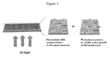 In a first alternative the UV light causes polymerization of a gel. For example, as shown in FIG. 5 the UV light photo-initiates polymerization of SFA at interstitial regions and the metal regions mask polymerization. In this way an array of gel features is produced.