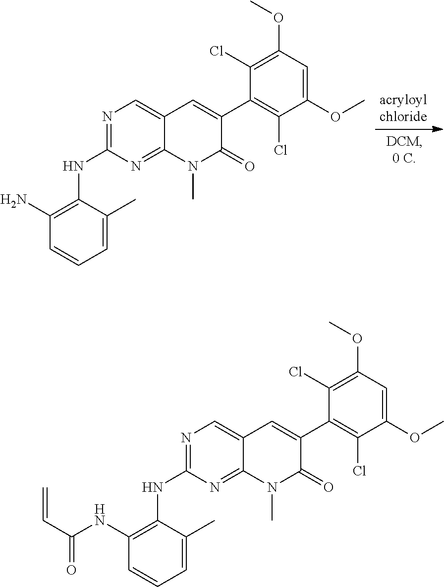 - RRPMRDMJTYFPRS-UHFFFAOYSA-N C=CC(=O)CC1=C(NC2=NC=C3C=C(C4=C(Cl)C(OC)=CC(OC)=C4Cl)C(=O)N(C)C3=N2)C(C)=CC=C1.C=S(C)(=O)C1=NC2=C(C=N1)C=C(C1=CC(OC)=CC(OC)=C1)C(=O)N2C.CC(C)(C)O[K].COC1=CC(OC)=C(Cl)C(C2=CC3=C(N=C(S(C)(=O)=O)N=C3)N(C)C2=O)=C1Cl.COC1=CC(OC)=C(Cl)C(C2=CC3=CN=C(NC4=C(N)C=CC=C4C)N=C3N(C)C2=O)=C1Cl.COC1=CC(OC)=C(Cl)C(C2=CC3=CN=C(NC4=C([N+](=O)[O-])C=CC=C4C)N=C3N(C)C2=O)=C1Cl.O=S(=O)(Cl)Cl Chemical compound C=CC(=O)CC1=C(NC2=NC=C3C=C(C4=C(Cl)C(OC)=CC(OC)=C4Cl)C(=O)N(C)C3=N2)C(C)=CC=C1.C=S(C)(=O)C1=NC2=C(C=N1)C=C(C1=CC(OC)=CC(OC)=C1)C(=O)N2C.CC(C)(C)O[K].COC1=CC(OC)=C(Cl)C(C2=CC3=C(N=C(S(C)(=O)=O)N=C3)N(C)C2=O)=C1Cl.COC1=CC(OC)=C(Cl)C(C2=CC3=CN=C(NC4=C(N)C=CC=C4C)N=C3N(C)C2=O)=C1Cl.COC1=CC(OC)=C(Cl)C(C2=CC3=CN=C(NC4=C([N+](=O)[O-])C=CC=C4C)N=C3N(C)C2=O)=C1Cl.O=S(=O)(Cl)Cl RRPMRDMJTYFPRS-UHFFFAOYSA-N 0.000 description 1