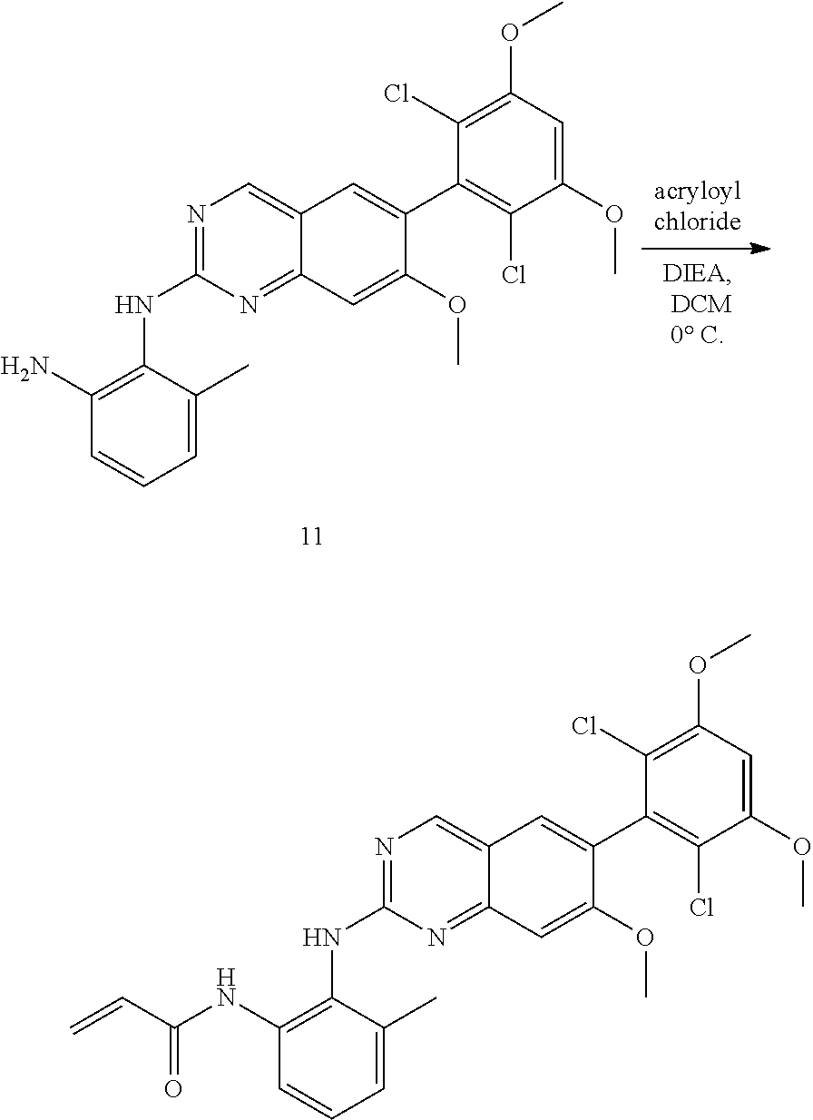 - QNWCKAMCJLTCOW-UHFFFAOYSA-N C=CC(=O)CC1=C(NC2=CC3=C(C=N2)C=C(C2=C(Cl)C(OC)=CC(OC)=C2Cl)C(=O)N3C)C(C)=CC=C1.CO.COC1=CC(OC)=C(Cl)C(C2=CC3=C(C=C(NC4=C([N+](=O)[O-])C=CC=C4C)N=C3)N(C)C2=O)=C1Cl.COC1=CC(OC)=C(Cl)C(C2=NC3=C(C=C(NC4=C(N)C=CC=C4C)N=C3)N(C)C2=O)=C1Cl.C[Pd].[HH] Chemical compound C=CC(=O)CC1=C(NC2=CC3=C(C=N2)C=C(C2=C(Cl)C(OC)=CC(OC)=C2Cl)C(=O)N3C)C(C)=CC=C1.CO.COC1=CC(OC)=C(Cl)C(C2=CC3=C(C=C(NC4=C([N+](=O)[O-])C=CC=C4C)N=C3)N(C)C2=O)=C1Cl.COC1=CC(OC)=C(Cl)C(C2=NC3=C(C=C(NC4=C(N)C=CC=C4C)N=C3)N(C)C2=O)=C1Cl.C[Pd].[HH] QNWCKAMCJLTCOW-UHFFFAOYSA-N 0.000 description 1