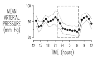 FIGS. 21A-21E illustrate circadian rhythm. FIG. 21A illustrates the circadian rhythm associated with mean arterial pressure for 24 hours from noon to noon; FIG. 21B illustrates the circadian rhythm associated with heart rate for 24 hours from noon to noon; FIG. 21C illustrates the circadian rhythm associated with percent change of stroke volume (SV %) for 24 hours from noon to noon; FIG. 21D illustrates the circadian rhythm associated with the percent change of cardiac output (CO) for 24 hours from noon to noon; and FIG. 21E illustrates the circadian rhythm associated with percent change of total peripheral resistance (TPR %), an index of vasodilation, for 24 hours from noon to noon. Various embodiments graph absolute values, and various embodiments graph percent values. In these figures, the shaded portion represents night hours from about 10 PM to 7 AM, and thus represents rest or sleep times. Referring to FIGS. 21A and 21B, for example, it is evident that both the mean arterial pressure and the heart rate are lowered during periods of rest. A higher blood pressure and heart rate can adversely affect rest. Additionally, a lower blood pressure and heart rate during the day can adversely affect a person's level of energy.