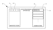 FIG. 3 shows data processing apparatus 3, in use. The data processing apparatus 3 comprises a chunk store 4, partitioned into chunk sections 9, and a manifest store 5. The manifest store 5 may be discrete from, and separate to, the chunk store 4 but both stores 4, 5 may reside on a common data storage medium or memory device. In one embodiment, both the chunk store 4 and manifest store 5 are stored in non-volatile storage.