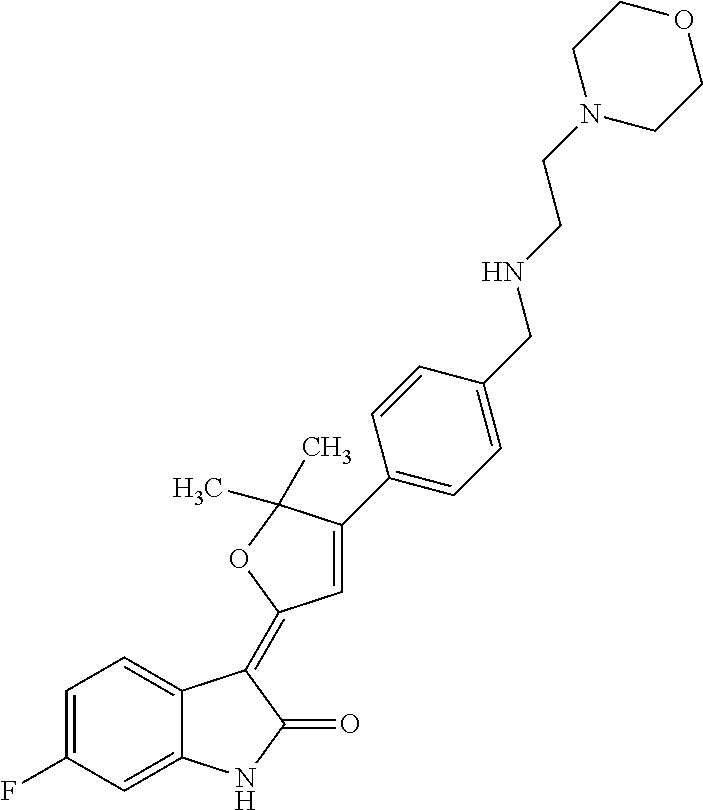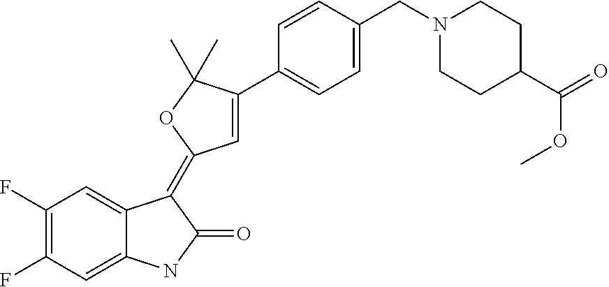 A mixture of 4-[(5E)-5-(6-fluoro-2-oxo-1,2-dihydro-3H-indol-3-ylidene)-2,2-dimethyl-2,5-dihydrofuran-3-yl]thiophene-2-carbaldehyde (120 mg, 0.34 mmol), 4-hydroxypiperidine (69 mg, 0.68 mmol) and 100 mg of 4 Å molecular sieves in 5 mL of anhydrous DMF was stirred under nitrogen for 16 hours. Acetic acid (20 mg) and 1M sodium cyanoborohydride (0.68 mL, 0.68 mmol) were then added. The mixture was diluted with 5 mL of anhydrous methanol and stirred at room temperature for 3 hours. The mixture was poured into 100 mL of water with stirring, and basified to about pH 8 with saturated NaHCO3 solution. The resulting precipitates were filtered, washed with water, and dried in vacuo to give the crude product, which was purified through silica gel column with 10-20% MeOH/CHCl3 to give (3E)-6-fluoro-3-[4-{5-[(4-hydroxypiperidin-1-yl)methyl]-3-thienyl}-5,5-dimethylfuran-2(5H)-ylidene]-1,3-dihydro-2H-indol-2-one as yellow powder. Yield: 38 mg, 26%.