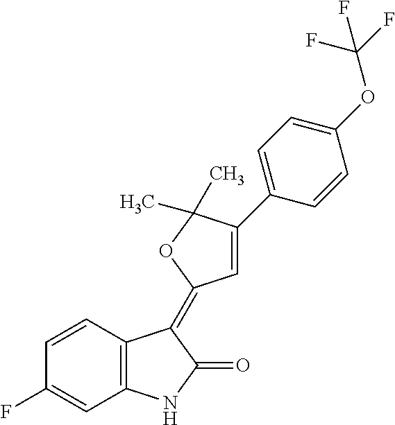 Method B: To a mixture of (3E)-3-(4-bromo-5,5-dimethylfuran-2(5H)-ylidene)-6-fluoro-1,3-dihydro-2H-indol-2-one (2.0 g, 6.1 mmol), 2-fluoropyridine-4-boronic acid (1.1 g, 8.0 mmol), potassium fluoride (1.8 g, 5 eq.) in dioxane (50 mL) and water (5 mL) under a nitrogen atmosphere, was added [1,1′-bis(diphenylphosphino)ferrocene]dichloropalladium(II) (250 mg, 5%). The mixture was heated at 80° C. for 20 hour. The reaction was allowed to cool to room temperature and ethyl acetate (350 mL) was added. The organic phase was washed with water (100 mL×2) and evaporated to provide the crude product. The crude product was purified by column chromatography (silica gel, 5% CH3OH/CH2Cl2 elution) and then recrystallized from ethyl acetate/hexanes (80/20) to provide (3E)-6-fluoro-3-[4-(2-fluoropyridin-4-yl)-5,5-dimethylfuran-2(5H)-ylidene]-1,3-dihydro-2H-indol-2-one as a yellow-orange solid (1.2 g, yield 57%).