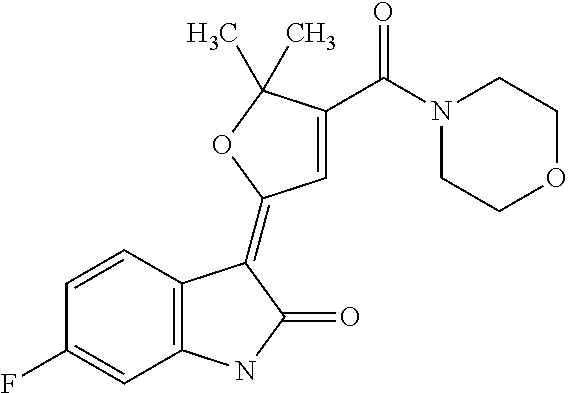 A pressure tube was charged with (3E)-3-(4-bromo-5,5-dimethylfuran-2(5H)-ylidene)-6-fluoro-1,3-dihydro-2H-indol-2-one (60 mg, 0.19 mmol), morpholine (48 mg, 0.56 mmol), Mo(CO)6 (49 mg, 0.19 mmol), palladium(II) acetate (4.0 mg, 0.018 mmol), DBU (85 mg, 0.56 mmol) and anhydrous THF (3 mL). The tube was immediately capped under nitrogen and heated in 108° C. bath for 1 hour. After cooling, the reaction mixture was filtered through a short celite pad. The filtrate was concentrated and purified by silica gel flash chromatography (5-10% MeOH in CHCl3) to give (3E)-3-[5,5-dimethyl-4-(morpholin-4-ylcarbonyl)furan-2(5H)-ylidene]-6-fluoro-1,3-dihydro-2H-indol-2-one as a yellow solid. Yield: 39 mg, 55%.