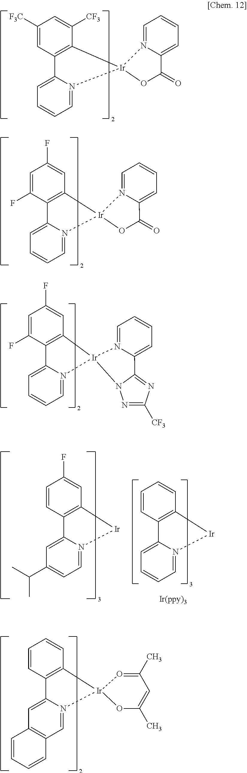 The phosphorescent light emitting material is preferably a compound containing a metal selected from iridium (Ir), osmium (Os), and platinum (Pt) because the compound has a high phosphorescent quantum yield, and can additionally improve the external quantum efficiency of the light emitting device. The material is more preferably a metal complex such as an iridium complex, an osmium complex, or a platinum complex. Of those, the iridium complex and the platinum complex are still more preferred. The metal complex is preferably an orthometalated metal complex in which a central metal atom and a carbon atom in a ligand are orthometal-bonded, and is more preferably an orthometalated iridium complex. More preferred forms of the orthometalated metal complex include the following iridium complexes.