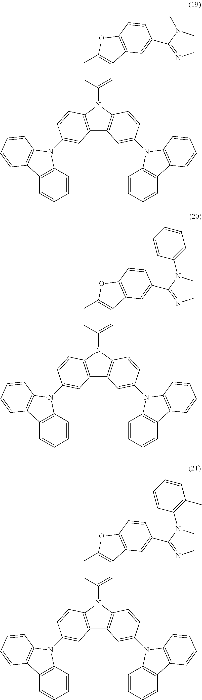 In addition, the characteristics are additionally improved by the fact that the three carbazolyl groups and the one dibenzofuranyl group or the one dibenzothiophenyl group are used as essential constituents, and in particular, a dicarbazolylcarbazole group is used and the dibenzofuranyl group or the dibenzothiophenyl group is combined with the group on its N atom. On the other hand, the introduction of any more dibenzofuranyl group or dibenzothiophenyl group, or the introduction of a high-molecular weight substituent results in too large a molecular weight for the synthesized compound to be stably sublimated, which may be disadvantageous in terms of the productivity of the material.