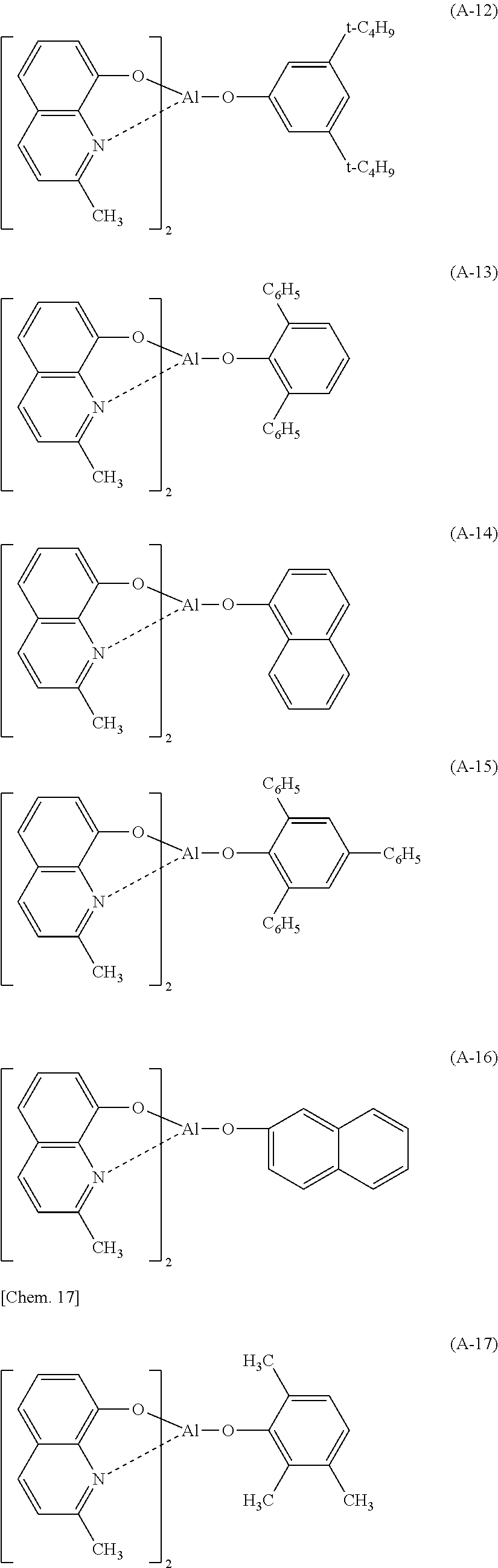 The alkali metal complex, alkaline earth metal complex, and rare earth metal complex are not particularly limited as long as they each contain, as a metal ion, at least one of alkali metal ions, alkaline earth metal ions, and rare earth metal ions. Further, a ligand is preferably quinolinol, benzoquinolinol, acrydinol, phenanthridinol, hydroxyphenyloxazole, hydroxyphenylthiazole, hydroxydiaryloxadiazole, hydroxydiarylthiadiazole, hydroxyphenylpyridine, hydroxyphenylbenzimidazole, hydroxybenzotriazole, hydroxyfulborane, bibyridyl, phenanthroline, phthalocyanine, porphyrin, cyclopentadiene, a β-diketone, an azomethine, a derivative thereof, or the like. However, the ligand is not limited thereto.