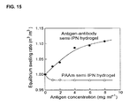 - FIG. 15 illustrates swelling of a hydrogel containing antigen-antibody complexes versus free antigen concentration.