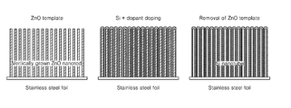 As shown in FIGS. 8B, 8C, 10B, and 10C, the volumes of the silicon nanotubes were expanded and shrunk, due to the charging and discharging. As shown in FIG. 10B, no cracks occurred on the surfaces of the silicon nanotubes after the charging and discharging. In FIGS. 8B, 9B, and 10B, the cross-sections of the silicon nanotubes were taken in a diagonal direction from the surfaces of the substrates. Thus, the lengths of the silicon nanotubes appearing in FIGS. 8B, 9B, and 10B differ from the actual lengths thereof.