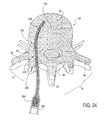 FIG. 24 is an elevational view, showing the attachment of a delivery device to the elongate member of FIG. 22 in which material is delivered through the delivery device and elongate member of FIG. 23, the material provided in a first partially injected position into the interior of the vertebra.