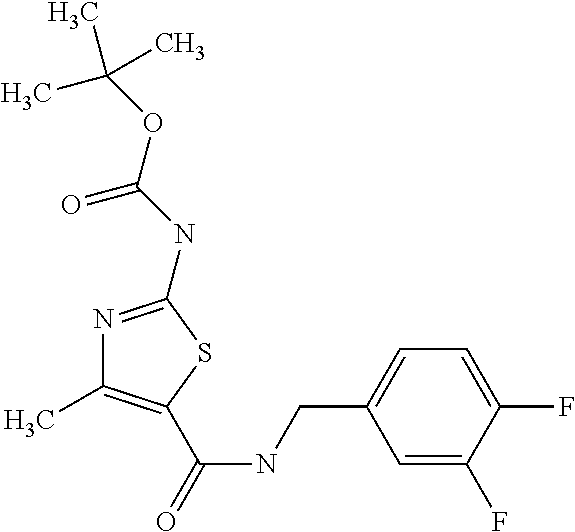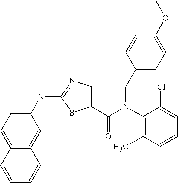 Compounds 556 to 566 were prepared according to the general procedure described below. A mixture of 2-bromo-N-[2-chloro-6-methylphenyl]-5-thiazolecarboxamide 319A, an aniline (1 eq), 1.0 N aqueous HCl (0.5 eq) in n-BuOH was heated overnight at 120° C. in a sealed vial. This was diluted with methanol and the product was isolated by preparative HPLC (YMC S5 ODS 30×100 mm column eluted with a gradient comprised of two solvent mixtures (mixture A: 10% MeOH, 90% water, and 0.1% TFA; mixture B: 90% MeOH, 10% water, and 0.1% TFA). For anilines substituted with a carboxylic acid group, the reaction mixture was treated with 1 N aqueous NaOH (5 eq) overnight before final purification of the product by HPLC. “HPLC Ret Time” is the HPLC retention time under the following conditions: YMC S5 OSD 4.6×30 mm (for 556 to 560) or YMC S7 ODS 3×50 mm column (for 561 to 566), 2 min gradient starting from 100% solvent A (10% MeOH, 90% H2O, 0.1% TFA) to 100% solvent B (90% MeOH, 10% H2O, 0.1% TFA), flow rate 5 mL/min, λ=220 nM.
