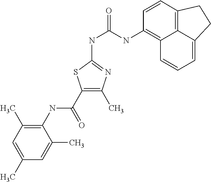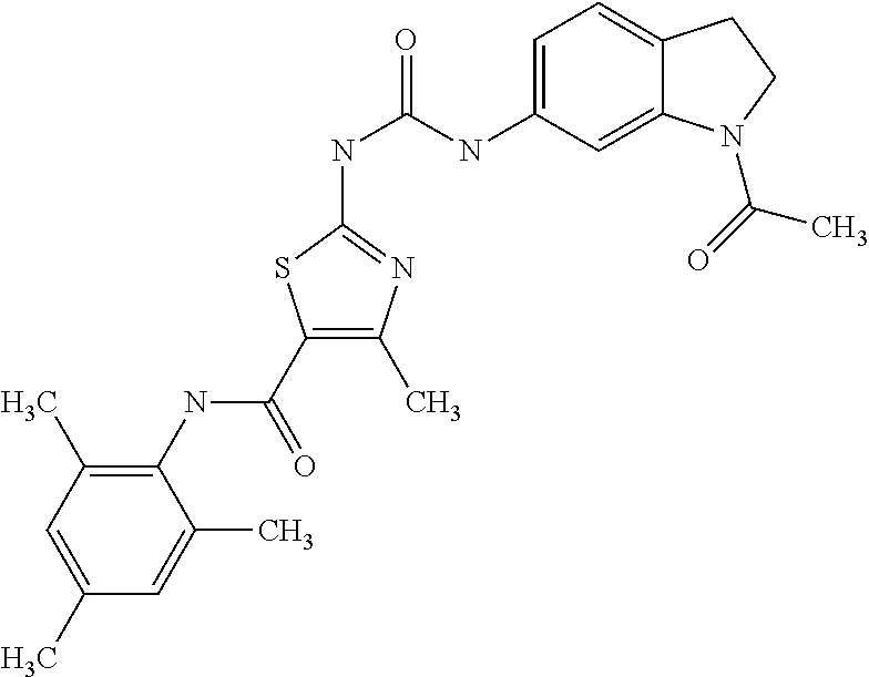 A solution of 2,4-difluoronitrobenzene (0.400 mL, 3.65 mmol, 1.00 equiv) in acetonitrile was charged with K2CO3 (0.605 g, 4.38 mmol, 1.20 equiv) followed by ethyl-2-amino-5-thiazolecarboxylate (0.628 g, 3.65 mmol, 1.00 equiv) as a solid. The heterogeneous mixture was sealed and heated to 120° C. overnight. The solution was filtered and then concentrated in vacuo. Purification by flash chromatography afforded ethyl-2-[(3-fluoro-6-nitro-1-phenyl)amino]-5-thiazolecarboxylate as a yellow solid (9%). This intermediate was coupled with 2-chloro-6-methyl aniline according to the procedure for compound 528 to afford N-(2-Chloro-6-methylphenyl)-2-[3-(fluoro-6-nitro-1-phenyl)amino]-5-thiazolecarboxamide (21%). The title compound was synthesized by reacting this intermediate with excess N-(3-aminopropyl)-imidazole at 80° C. followed by purification by reverse phase preparative HPLC.