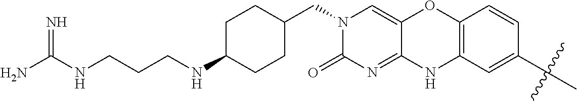 - YFINMTSESNZCPQ-SHTZXODSSA-N N=C(N)NCCCNC(=O)[C@H]1CC[C@H](N2C=C3OC4=C(NC3=NC2=O)C(OCCN)=CC=C4)CC1 Chemical compound N=C(N)NCCCNC(=O)[C@H]1CC[C@H](N2C=C3OC4=C(NC3=NC2=O)C(OCCN)=CC=C4)CC1 YFINMTSESNZCPQ-SHTZXODSSA-N 0.000 description 3