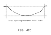 FIG. 4Cb is a chart representing the shape and depth of a recessed portion associated with the raised element (i.e., relief) of the text character taken along the measurement vector indicated by the arrow shown in FIG. 4Ca. The maximum depth of the recessed portion, i.e., the cleanout depth, along the measurement vector was 65 microns for the text character shown in FIG. 4Ca.