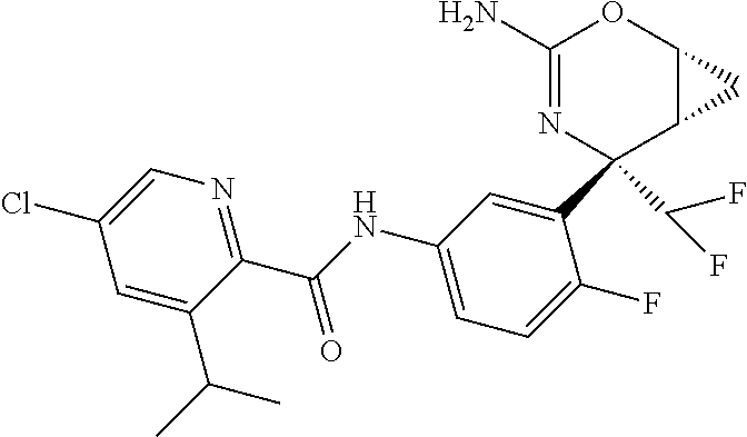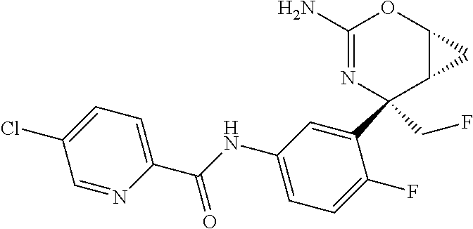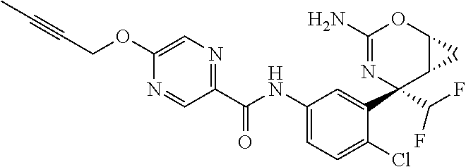 - N-(3-((1R,5R,6R)-3-amino-5-methyl-2-oxa-4-azabicyclo[4.1.0]hept-3-en-5-yl)-4-fluorophenyl)-5-methoxy-2-pyrazinecarboxamide.