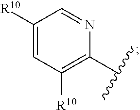 - wherein V is NR10, O or S; and each W, independently, is CH, CF, CCl, CCH3 or N.