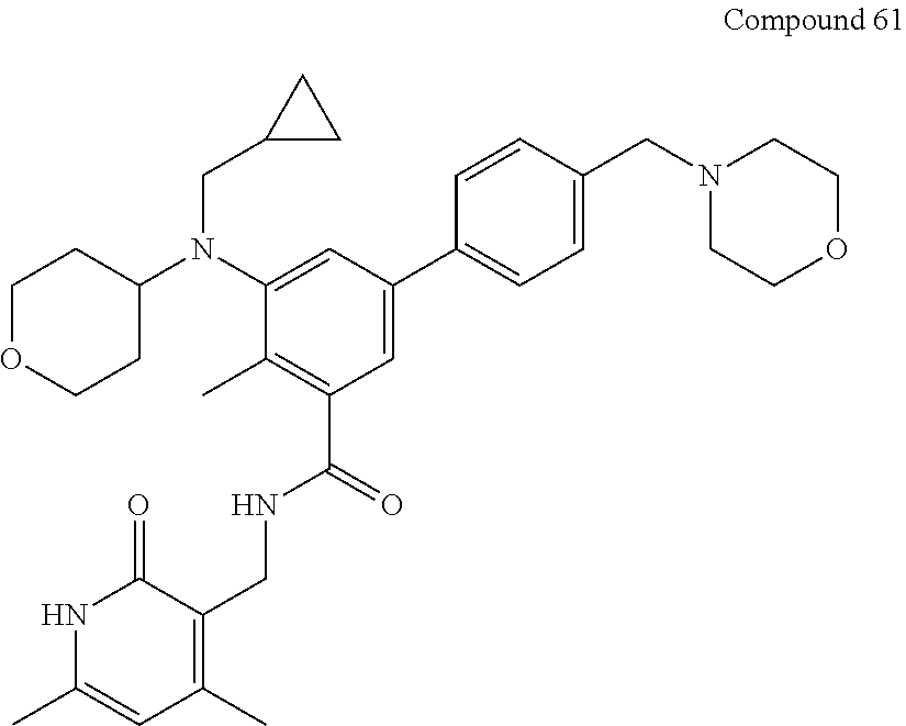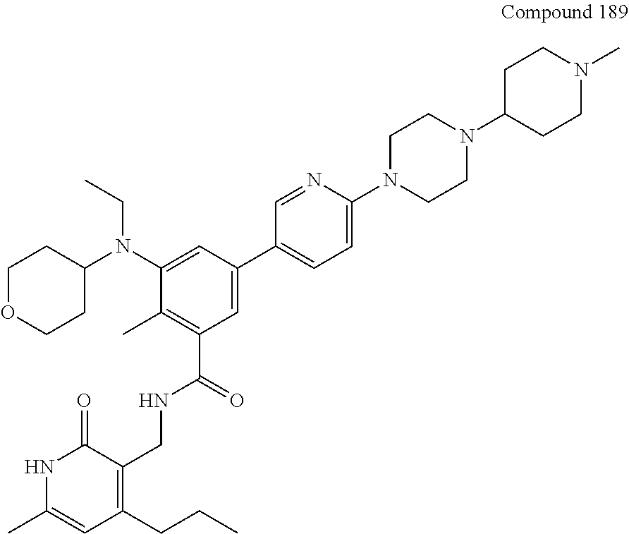 In order to test whether Compound 141 could induce a tumor growth inhibition in vivo WSU-DLCL2 xenograft tumor bearing mice were treated with Compound 141 at 12.5, 25 or 50 mg/kg QD for 28 days via intraperitoneal injection. Tumor volume and body weights were determined twice a week. Compound 141 was well tolerated at all doses with minimal body weight loss. A parallel cohort of mice (n=4 per group) was treated at the same doses for 7 days, and mice were euthanized on day 7, 3 h after the last dose for tumor sampling and assessment of target inhibition. FIG. 5 shows the result of the ELISA measuring global methylation of H3K27me3 normalized to total H3. Dose dependent target inhibition ranging from 39% to 67% compared to vehicle can be observed.