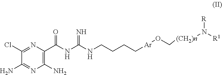 Compound (Ia) 3,5-diamino-6-chloro-N—(N-(4-(4-(2-(hexyl((2S,3R,4R,5R)-2,3,4,5,6-pentahydroxyhexyl)amino)ethoxy)phenyl)butyl)carbamimidoyl)pyrazine-2-carboxamide was a potent inhibitor of transcellular sodium transport and was approximately 60-fold more active than amiloride in canine bronchial epithelial cells (CBE), and approximately 160-fold in human bronchial epithelial cells (HBE). In CBE Compound (Ia) had an IC50 of 13.2±8.0 nM and in HBE Compound (Ia) had an IC50 of 2.4±1.8 nM (Table 1).