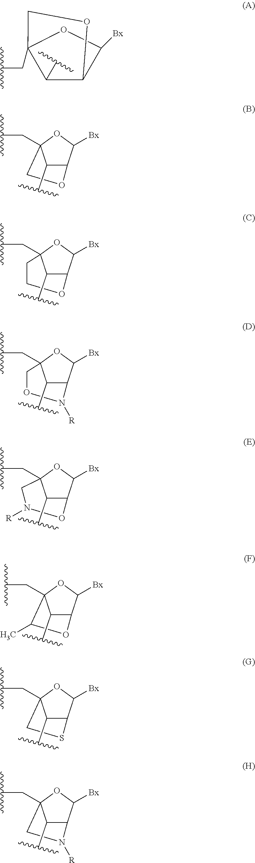 In certain embodiments, G is halogen, OCH3, OCH2F, OCHF2, OCF3, OCH2CH3, O(CH2)2F, OCH2CHF2, OCH2CF3, OCH2—CH═CH2, O(CH2)2—OCH3, O(CH2)2—SCH3, O(CH2)2—OCF3, O(CH2)3—N(R6)(R7), O(CH2)2—ON(R6)(R7), O(CH2)2—O(CH2)2—N(R6)(R7), OCH2C(═O)—N(R6)(R7), OCH2C(═O)—N(R8)—(CH2)2—N(R6)(R7) or O(CH2)2—N(R8)—C(═NR9)[N(R6)(R7)] wherein R6, R7, R8 and R9 are each, independently, H or C1-C6 alkyl. In certain embodiments, G is F, OCH3, O(CH2)2—OCH3, OCH2C(═O)—N(H)CH3 or OCH2C(═O)—N(H)—(CH2)2—N(CH3)2.
