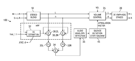 26A. The stereo audio circuit claimed in claim 21 further comprising a high pass filter that includes a DC estimator responsive to said approximately monaural output from said stereo extractor and coupled with said envelope detector to make the envelope detector substantially resistant to near-DC drifts due to synthesizer pulling, whereby enhancing audio quality at the outputs of the volume control.