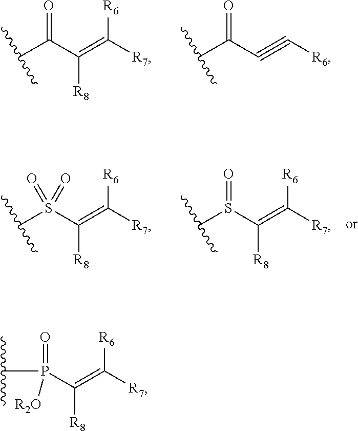 indicates the point of attachment between the inhibitor and the tyrosine kinase. In a further embodiment, the inhibitor is covalently bound to a cysteine residue on the tyrosine kinase.