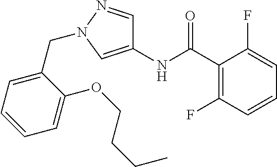 In one embodiment there is provided (2,6-Difluoro-N-(1-{[2-fluoro-6-(trifluoromethyl)phenyl]methyl}-1H-pyrazol-4-yl)benzamide).