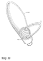 FIG. 14B shows the features of components of FIG. 14A, according to one embodiment, but now showing nearly completed forced compliance of an active beak element 13 alignment with the inside diameter of the scoopula portion of an outer sheath 512.