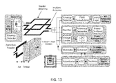 FIG. 13 depicts a block diagram of a system comprising the implantable integrated device, a corresponding external transmitter/reader and an interface region between the two.
