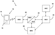 The MSC/VLR 30 provides essentially the same functionality as a central office switch in a public-switched telephone network (PSTN) and is additionally responsible for call processing, mobility management, and radio resource management. The MSC/VLR 30 is further in communication with a home location register (HLR) 40. The HLR 40 is the primary database in the PLMN provided by the mobile communications system 10 that stores information about mobile users. To this end, the HLR 40 communicates with an authentication center (AUC) 50.