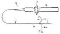 FIG. 10B is a plan view of a catheter in accordance with an embodiment of the present invention, with a uni-directional distal deflection (in full deflection) and a bi-directional proximal deflection (in partial deflection).
