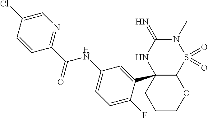- NEGSZBCTATUMDD-GPMSIDNRSA-N CN1C(=N)N[C@@]2(C3=CC(NC(=O)C4=NC=C(Cl)C=C4)=CC=C3F)CO[C@H](CF)[C@H]2S1(=O)=O Chemical compound CN1C(=N)N[C@@]2(C3=CC(NC(=O)C4=NC=C(Cl)C=C4)=CC=C3F)CO[C@H](CF)[C@H]2S1(=O)=O NEGSZBCTATUMDD-GPMSIDNRSA-N 0.000 description 4