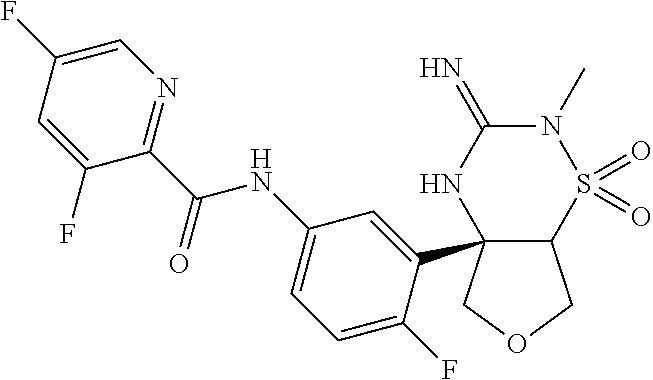 - NQPSXRGMQCIRBS-GPMSIDNRSA-N CN1C(=N)N[C@@]2(C3=CC(NC(=O)C4=NC=C(F)C=C4)=CC=C3F)CO[C@H](CF)[C@H]2S1(=O)=O Chemical compound CN1C(=N)N[C@@]2(C3=CC(NC(=O)C4=NC=C(F)C=C4)=CC=C3F)CO[C@H](CF)[C@H]2S1(=O)=O NQPSXRGMQCIRBS-GPMSIDNRSA-N 0.000 description 4