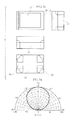 As the first through the third LED modules 2A, 2B and 2C, the LED modules shown in FIGS. 20-58 may be employed. These figures show the schematic outer configuration or directivity characteristics of each LED module. Each view showing the outer configuration of an LED module includes, from the top, a top view, a side view and a bottom view, and a right side view on the right of the top view. FIGS. 20-32 each shows an LED module with a reflector which can be employed as the first LED module 2A. The directivity characteristics of the first LED module 2A are such that the relative intensity RI is highest at the direction angle Da of 0°. FIGS. 33-42 each shows an LED module for sideways light emission which can be employed as the second LED module 2B. The directivity characteristics of the second LED module 2B are such that the direction in which the direction angle Da=0° corresponds to the outward direction within the plane of the mount surface 1 a of the support substrate 1. FIGS. 43-58 each shows an LED module with uniform intensity distribution which can be employed as the third LED module 2C. The directivity characteristics of the third LED module 2C are such that the relative intensity RI is not highest at the direction angle Da of 0°. It is to be noted that the LED modules shown in FIGS. 24 and 49 are of the type that emits two colors of light, whereas the LED modules shown in FIGS. 29, 39 and 57 are of the type that emits three colors of light.