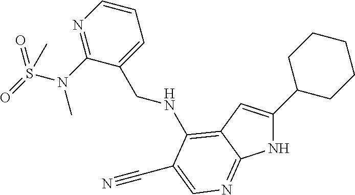 - CIXSHAARRHFDJB-UHFFFAOYSA-N n-[3-[[(5-cyano-2-cyclohexyl-1h-pyrrolo[2,3-b]pyridin-4-yl)amino]methyl]pyridin-2-yl]-n-methylmethanesulfonamide Chemical compound CS(=O)(=O)N(C)C1=NC=CC=C1CNC1=C(C#N)C=NC2=C1C=C(C1CCCCC1)N2 CIXSHAARRHFDJB-UHFFFAOYSA-N 0.000 claims description 2