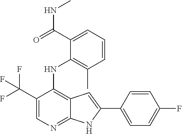 - NCXYJMXMFPSZAX-UHFFFAOYSA-N 2-[[2-(4-fluorophenyl)-5-(trifluoromethyl)-1h-pyrrolo[2,3-b]pyridin-4-yl]amino]-n,3-dimethylbenzamide Chemical compound CNC(=O)C1=CC=CC(C)=C1NC1=C(C(F)(F)F)C=NC2=C1C=C(C=1C=CC(F)=CC=1)N2 NCXYJMXMFPSZAX-UHFFFAOYSA-N 0.000 claims description 3